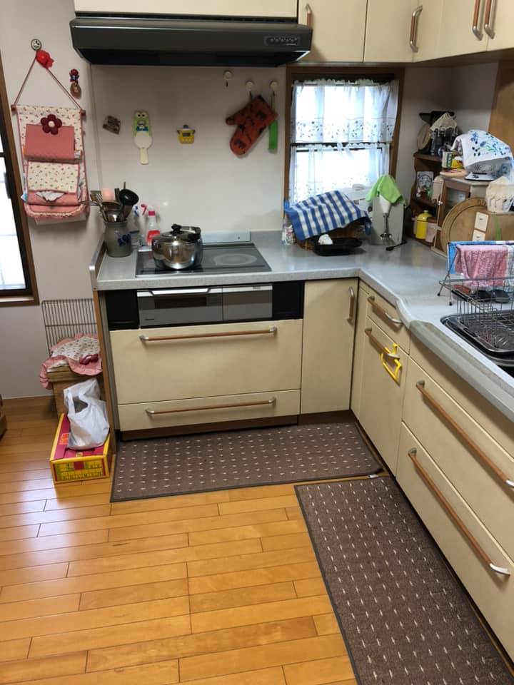明るいカバ桜材のL型キッチンで、ウォールキャビネットは、躯体はそのままで扉だけお造りいたしました!バックキャビネットは別注でお造りしてこちらもイメージ通りでキッチン中が明るくなりました。